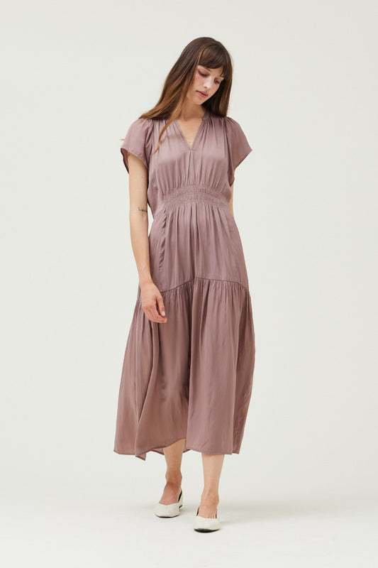 Grade + Gather - Ruffle Satin Midi Dress - Dusty Lilac