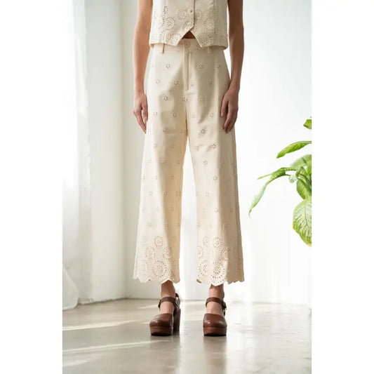 Eyelet Wide Leg Cotton Pants - Cream