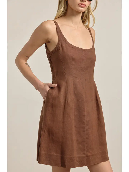 Linen Square Neck Mini Dress - Brown