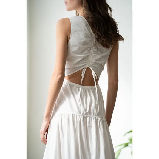 Sleeveless Tiered Dress with Back Ruched Detail - White