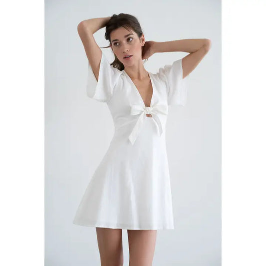 Tie-Front Short Sleeve Fitted Dress - White