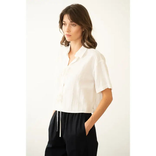 Tie-Front Short Sleeve Collared Shirt - White