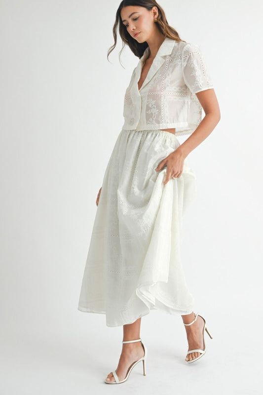 Eyelet Short Sleeve Patchwork Collared Crop Shirt - Off White