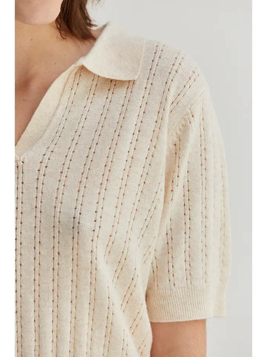 Saman Pointelle Knit Polo Top - Cream