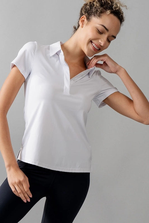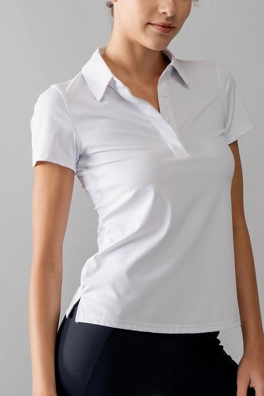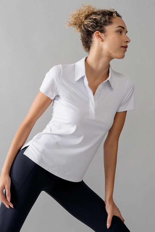 This White Button Polo Shirt features a golf tee design, making it perfect for a day on the green. Its flattering fit is sure to elevate your golf game. Stay comfortable while looking stylish on the course.