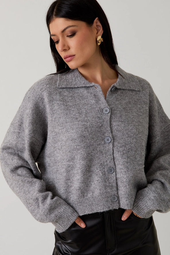 This heathered gray collared sweater cardigan offers a flattering fit with a cozy, soft texture perfect for fall. Designed to combine style and comfort, it’s ideal for layering during cooler days while maintaining a polished look. Its versatile neutral tone complements any outfit, making it a dependable wardrobe staple for the season.