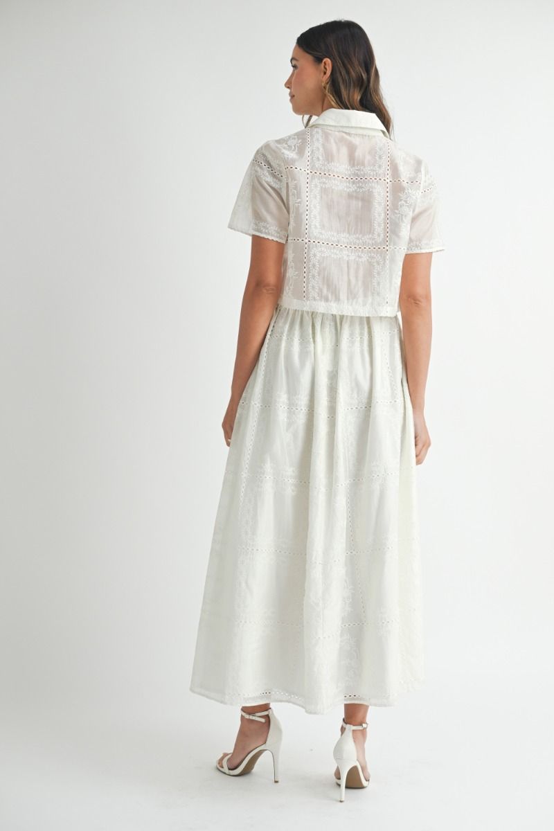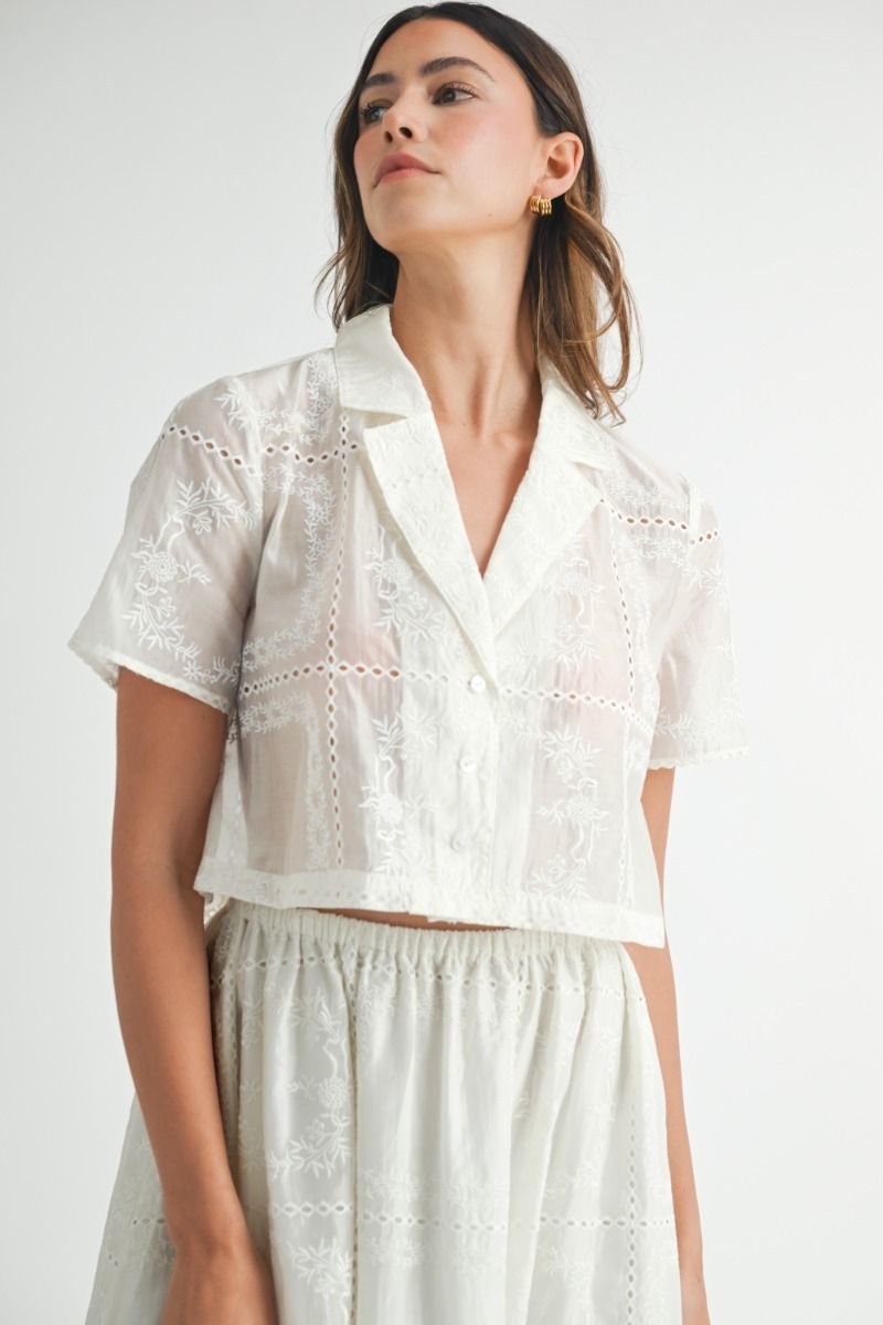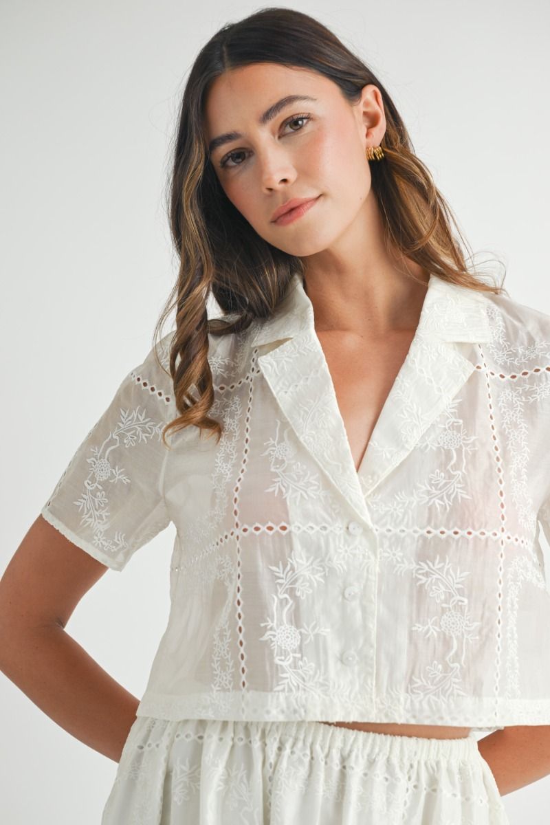 Eyelet Short Sleeve Patchwork Collared Crop Shirt - Off White