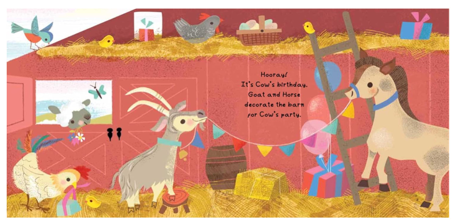 Discover the sounds of the farm animals with these elegantly illustrated books. Let the amusing farm story come to life by pulling the tabs to activate the four sounds with an additional sound by pushing a button! A musical story to discover over and over again! "Hooray! It’s Cow’s birthday.