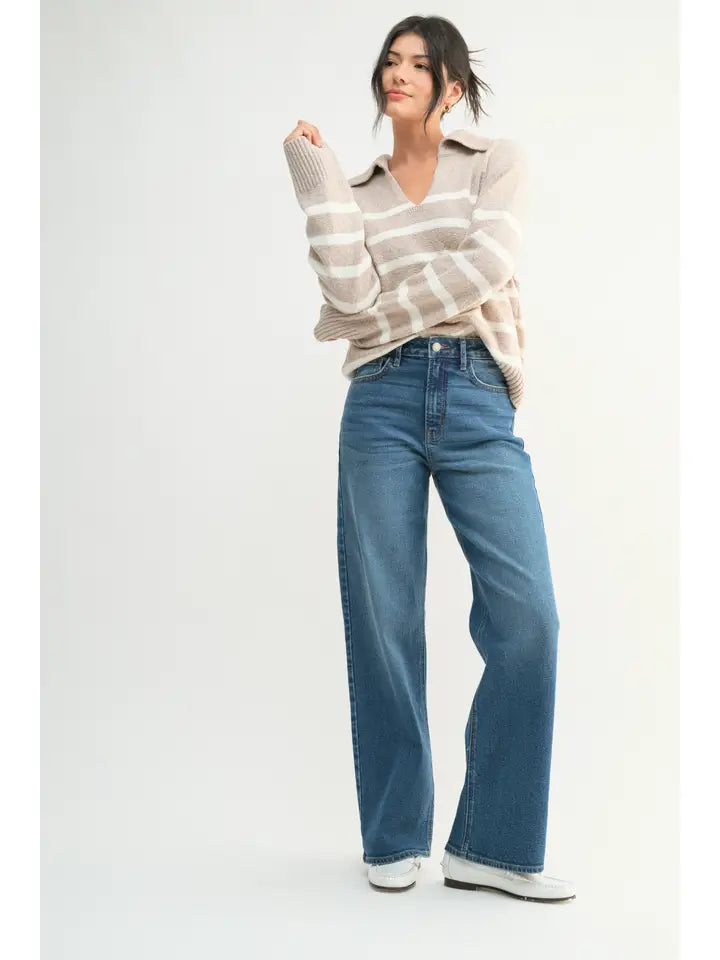These High Rise Full Length Straight Jeans in Dark Denim offer a trendy and flattering fit. With the perfect balance of style and comfort, they are a must-have addition to your wardrobe. Feel confident and look cute in these fashionable jeans.