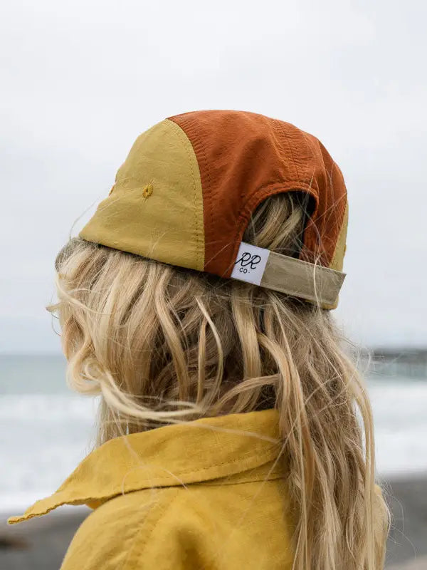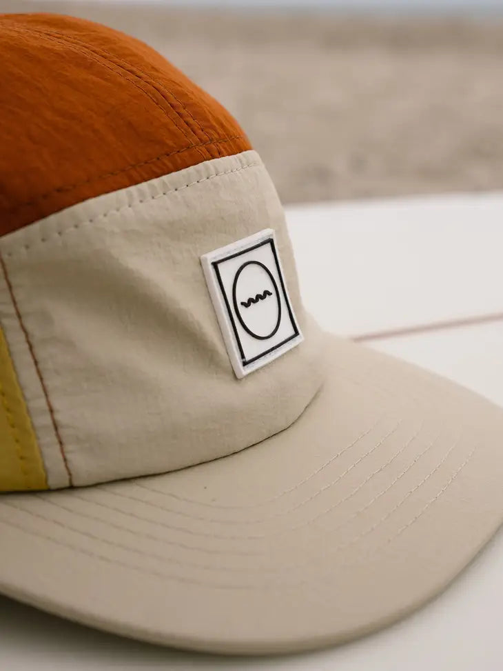 This color block hat is made of water resistant nylon in mustard yellow, burnt orange, and the perfect cream. it features a rubber patch, fabric eyelets on the side panels, and an adjustable velcro back.