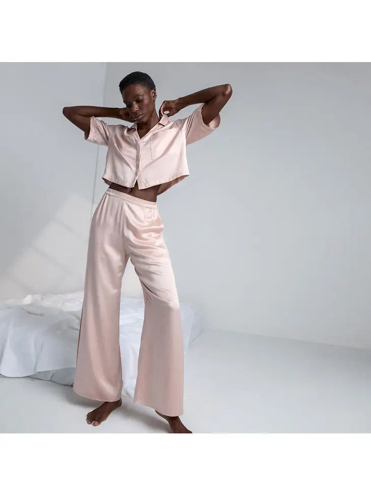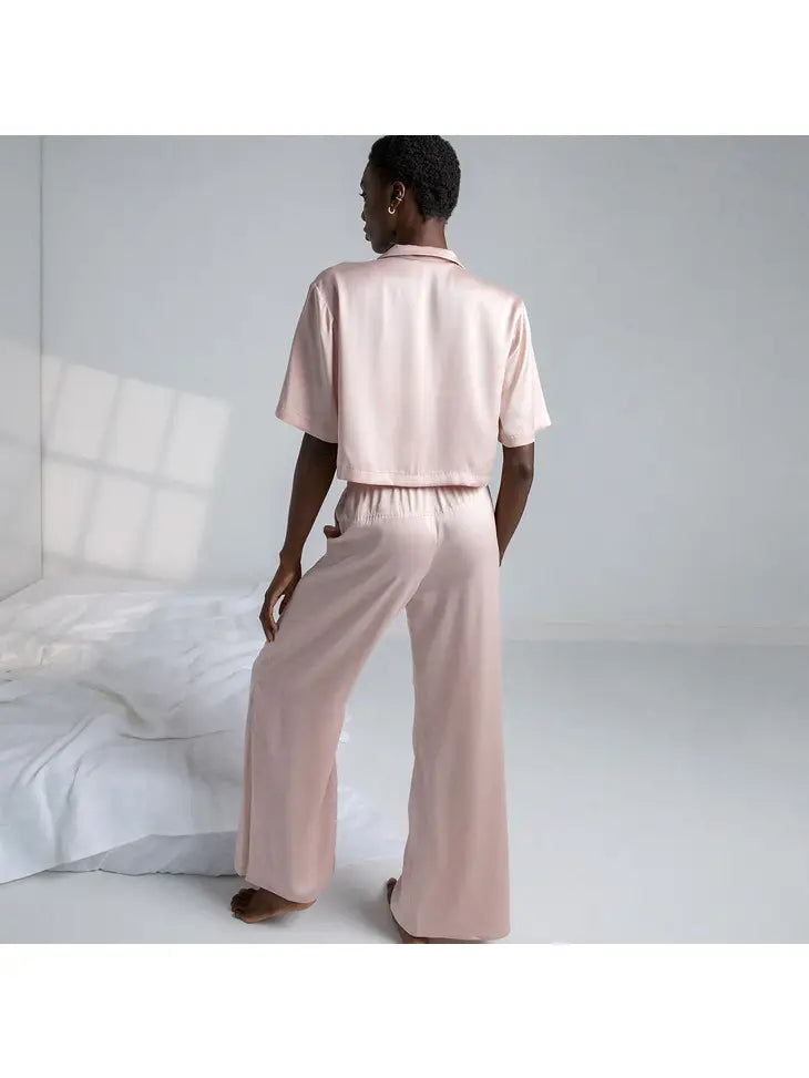 A high-rise version of our best selling Washable Silk Button Down Pant Set, this set has an ultra-flattering flat front waist pant with side slit (for hot sleepers who want a little leg ventilation), but the top comes in a cropped length that hits perfectly at the waistband. Bonus? Chic elongated arm length that hits at the elbows.