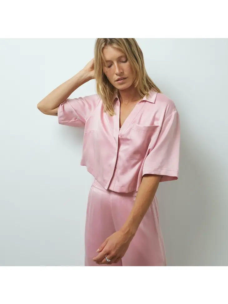 A high-rise version of our best selling Washable Silk Button Down Pant Set, this set has an ultra-flattering flat front waist pant with side slit (for hot sleepers who want a little leg ventilation), but the top comes in a cropped length that hits perfectly at the waistband. Bonus? Chic elongated arm length that hits at the elbows.