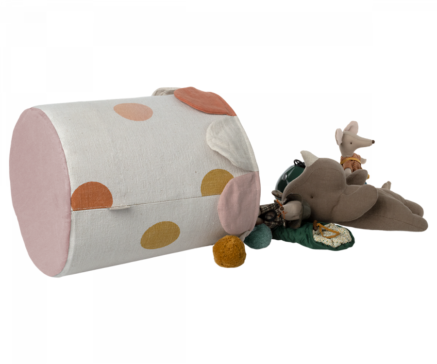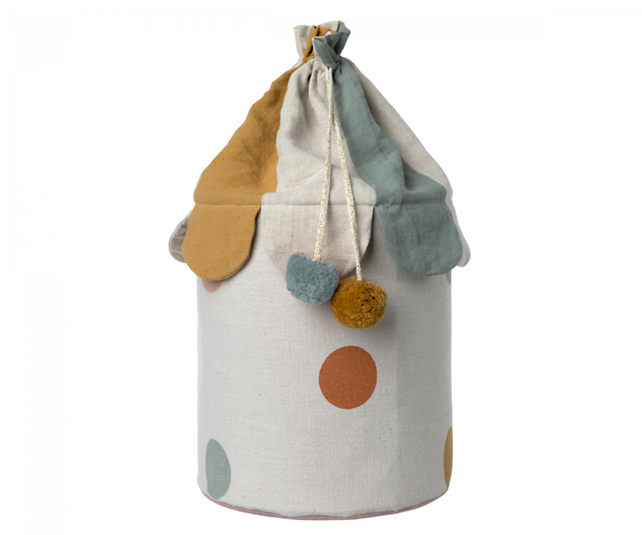 This colorful, soft basket is the perfect storage for any toy in the playroom. Close the basket to hide all the mess. This basket comes in two color versions, one with a rose and one with a blue bottom. Mix it with the other Maileg interior styles.