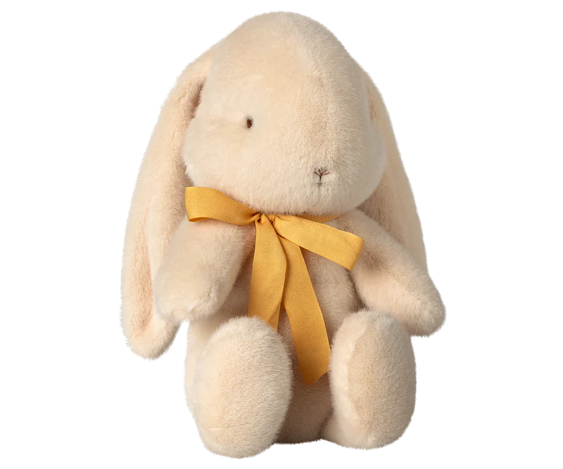 This bunny comes in very soft and unique plush fabric. It has a beautiful bow around the neck. It has a very sweet look and will soon be someone's very best friend.
