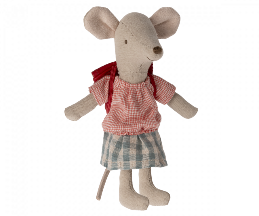 Big sister mouse is ready for a day in school, carrying her backpack on the back. She has magnets in her hands so she can hold the handles of the tricycle for a fast trip.