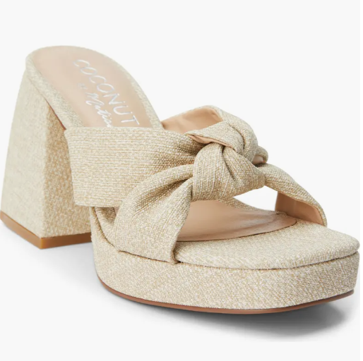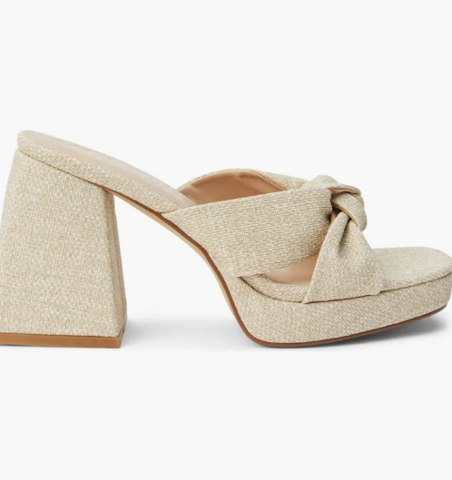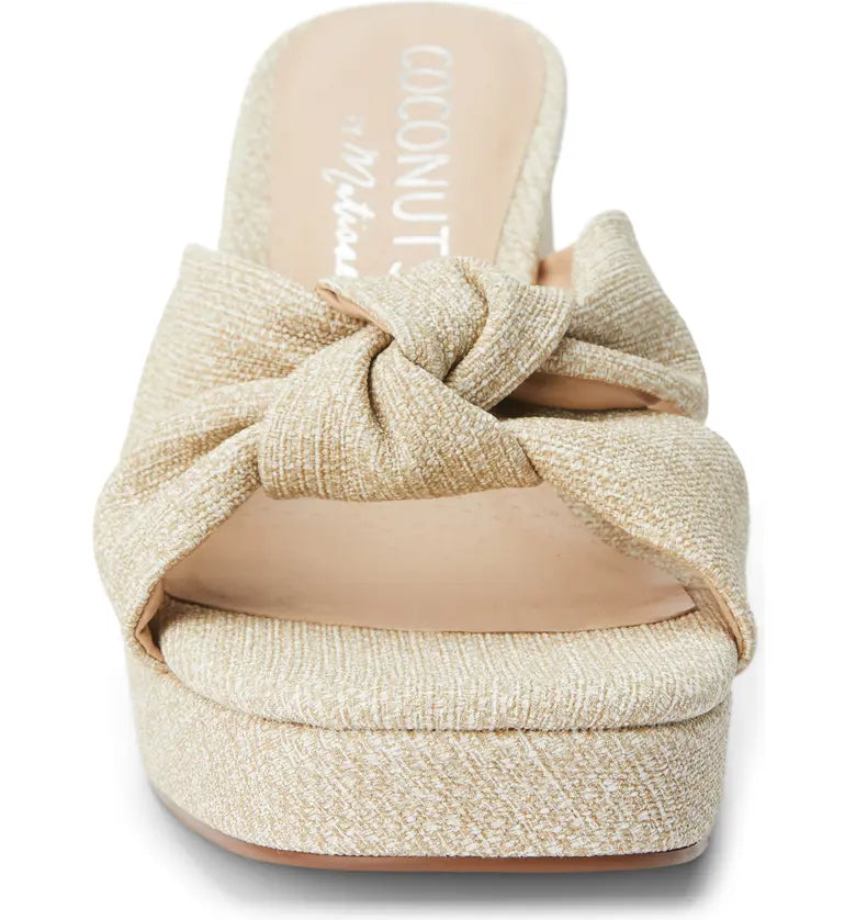 A knotted vamp creates a gathered effect for dimensional intrigue on a slide sandal lofted by a block heel and platform for trend-right appeal.