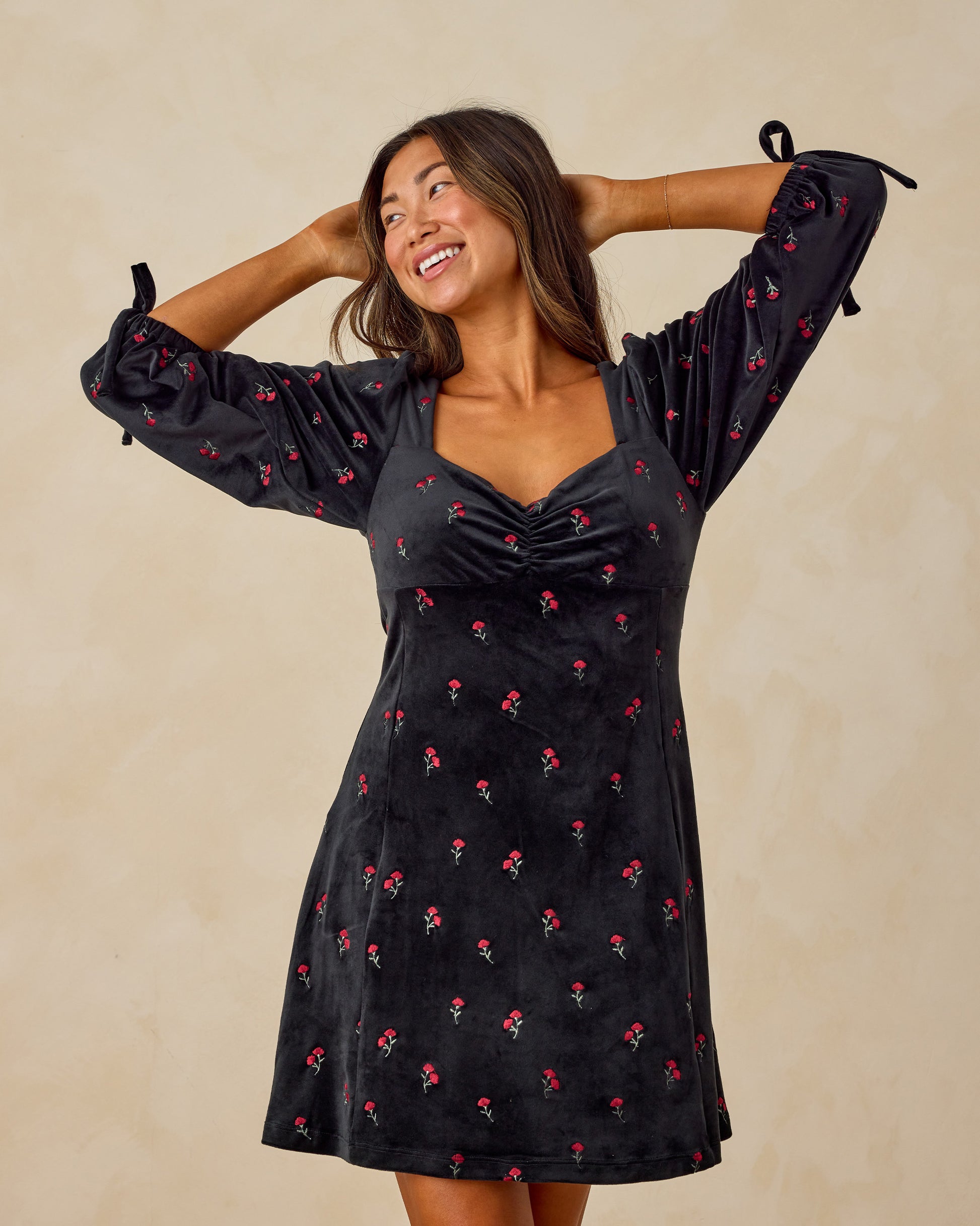 Featuring our ‘velvet floral’ print on our ‘black’ hue. These red embroidered flowers are sure to be a statement at any holdiday gathering this winter.