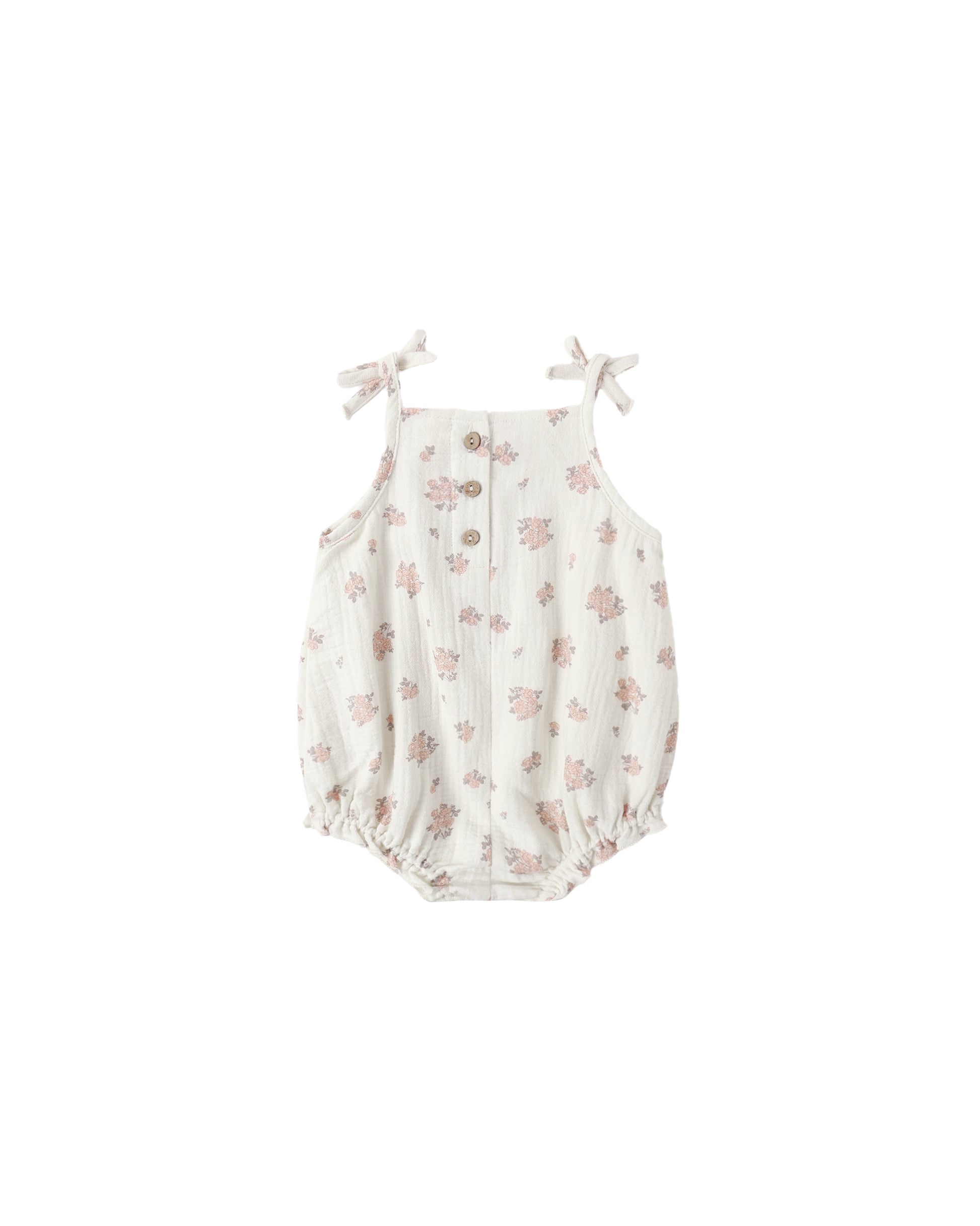 This romper features a smocked front bodice, button closure at the back, elastic leg openings with ruffle detail, and bottom snap closure to ensure easy changing.