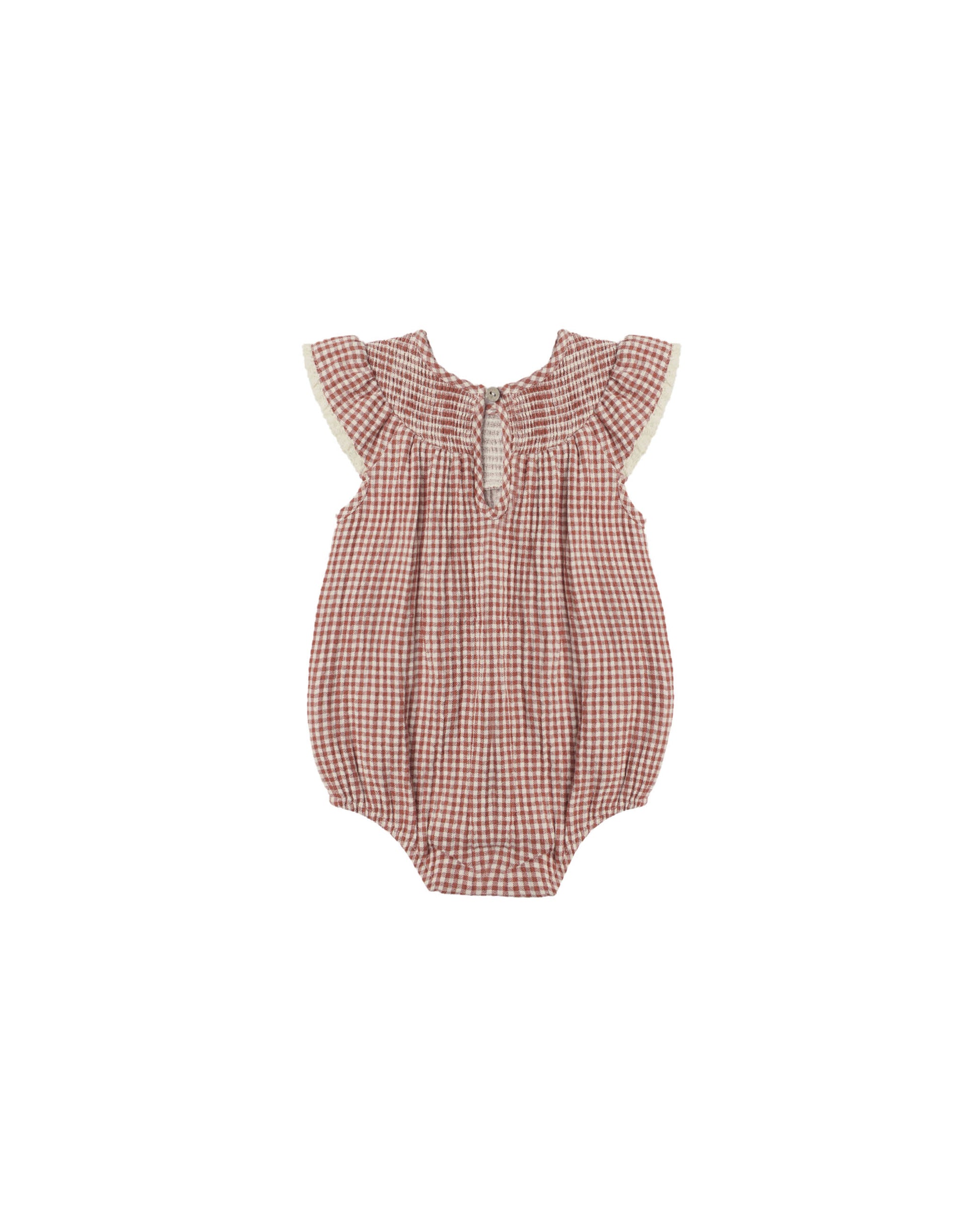 The Lenore Romper features ruffle sleeves with crochet lace trim, smocked neckline with red embroidered hearts, button at back neck, elastic leg openings and bottom snap closures for easy changes and a perfect fit.