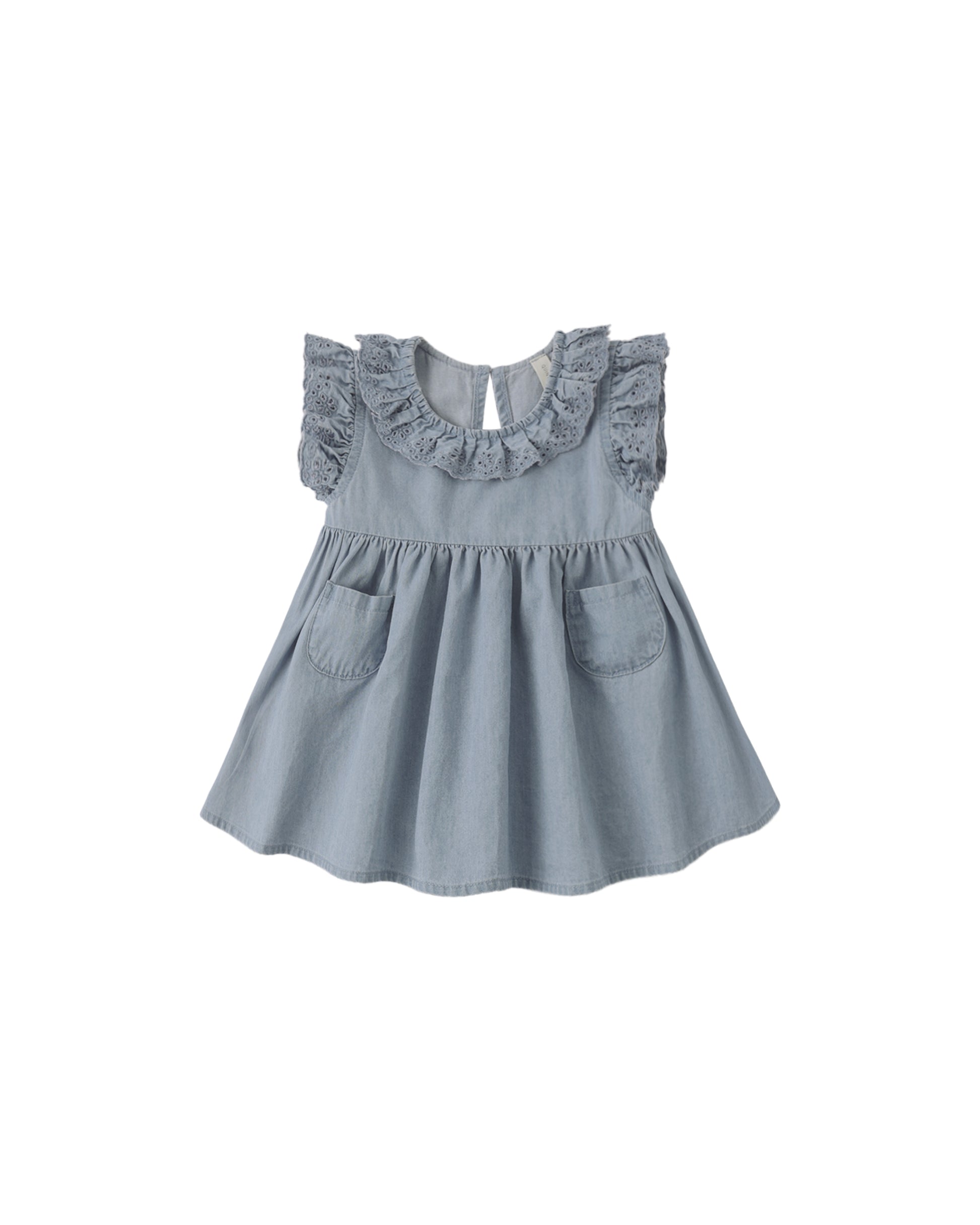 Our Sophie Dress features a beautiful collar and ruffle sleeves with eyelet detail, and cute front pockets. Matching bloomers included in all sizes.