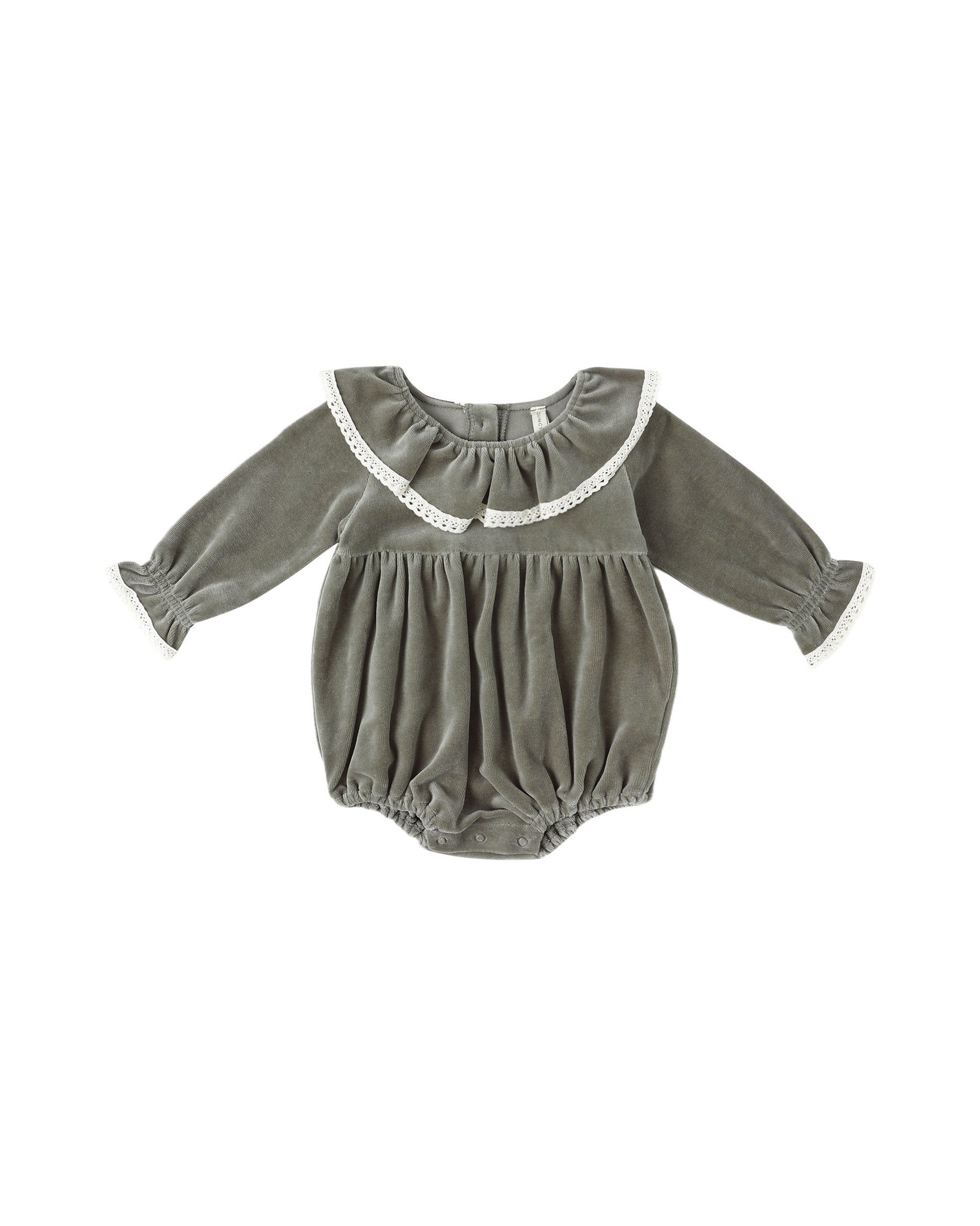 Longsleeve velour romper with gathered waist, ruffle collar, and lace trim details at neckline and cuffs. Snap closures along the inseam for easy changing.