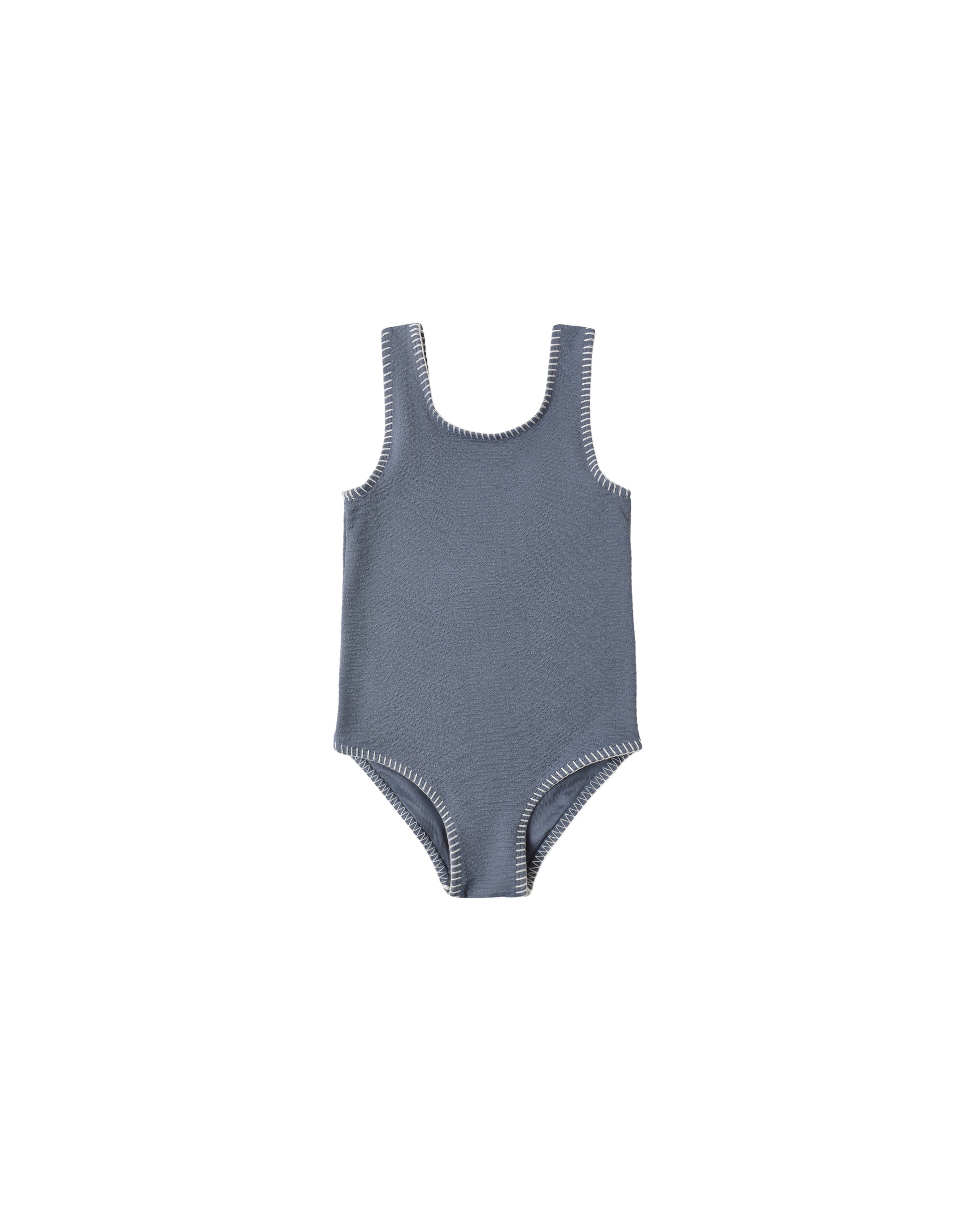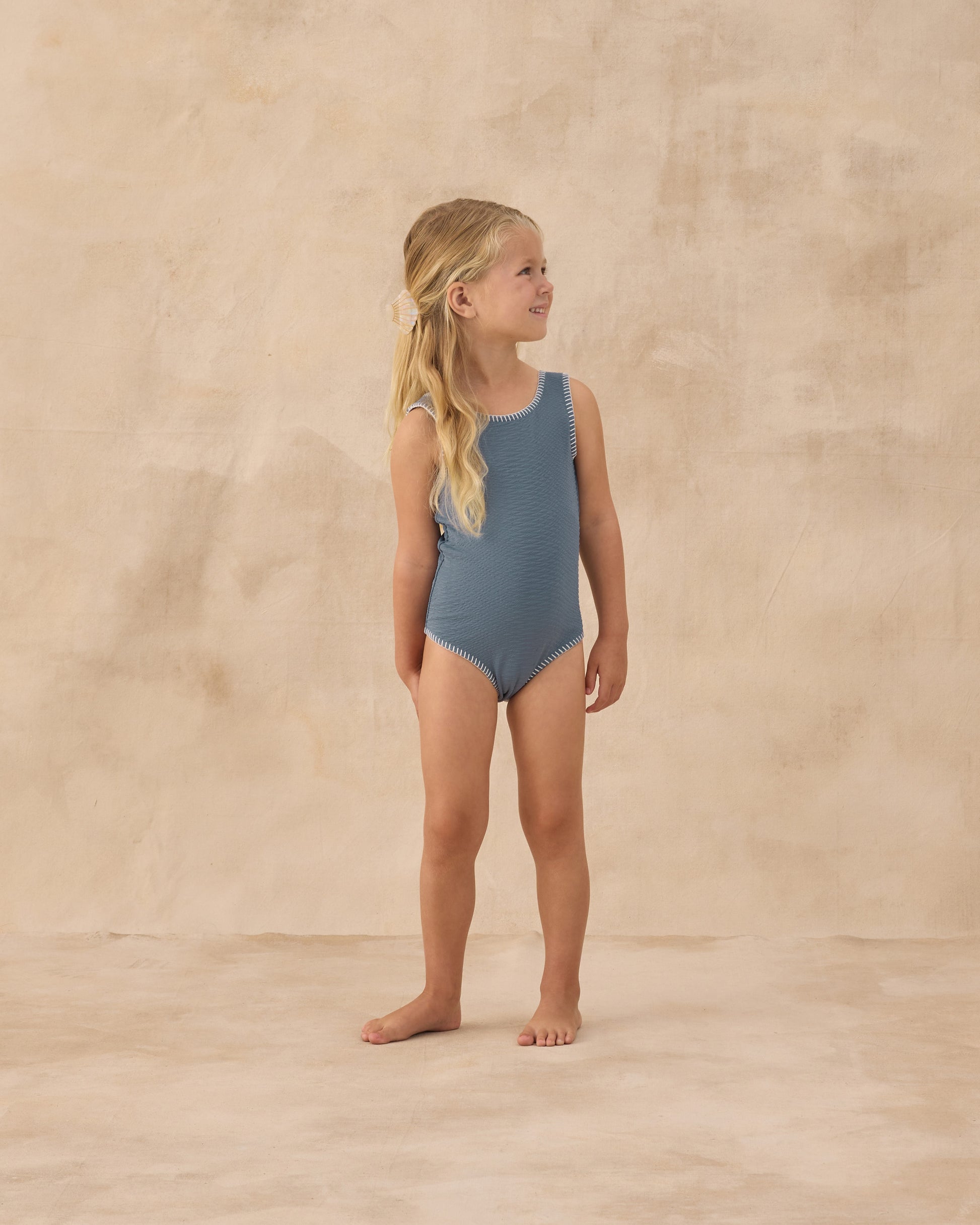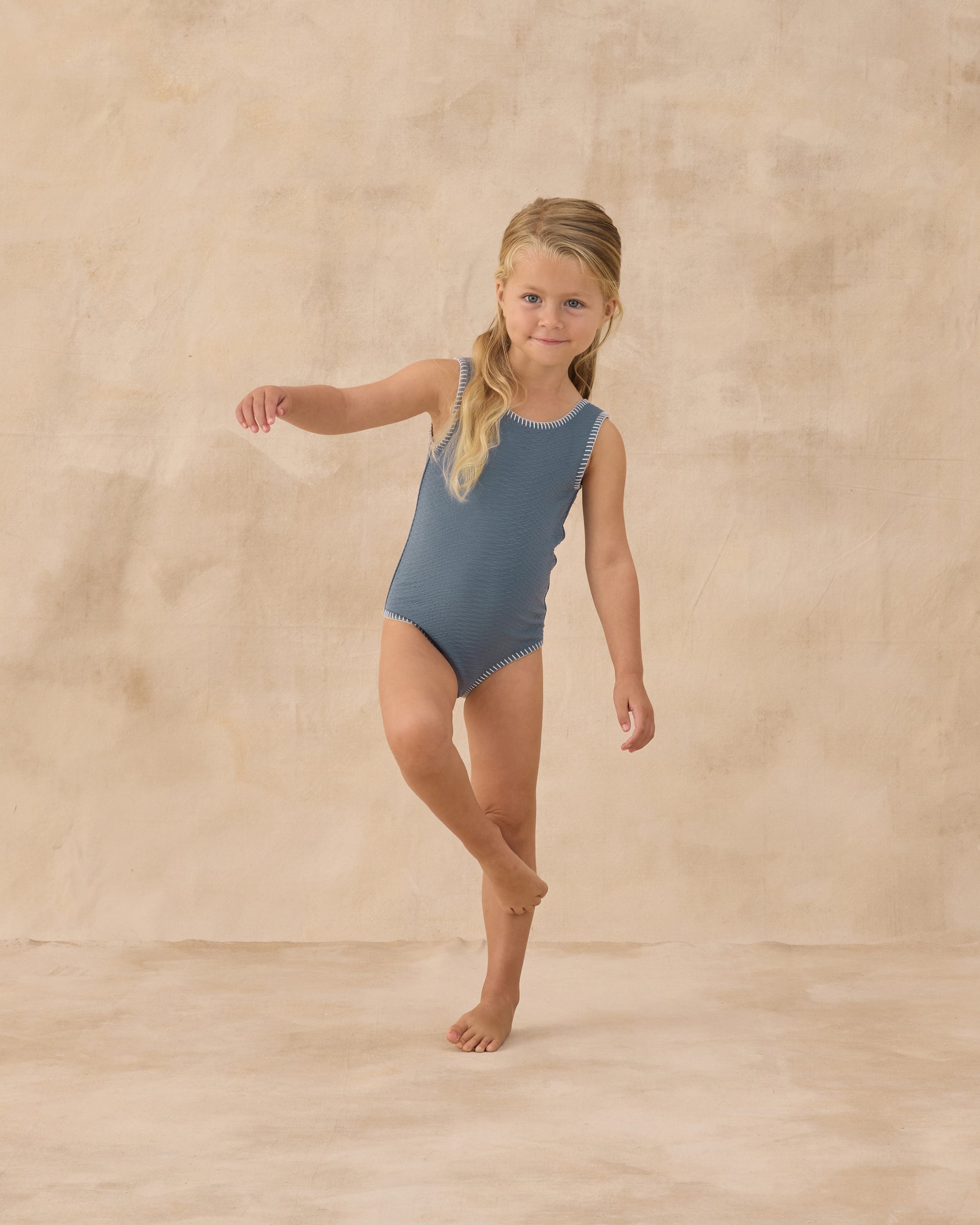 Featuring our 'marine' hue. This textured one-piece is perfect for a timeless summer look.