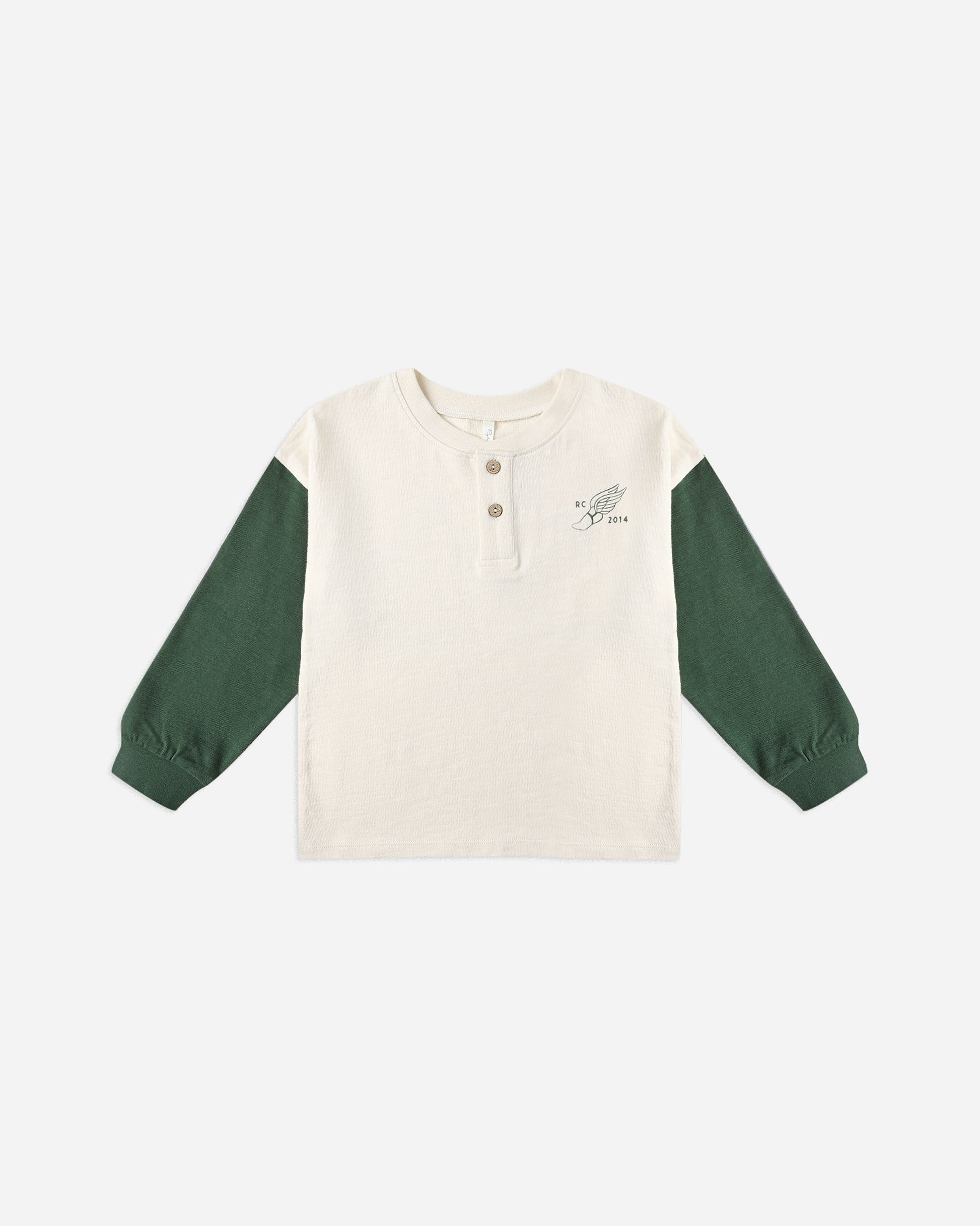 Add vintage track-and-field vibes to your wardrobe with this relaxed-fit long sleeve tee, featuring contrast sleeves and a center front button placket.