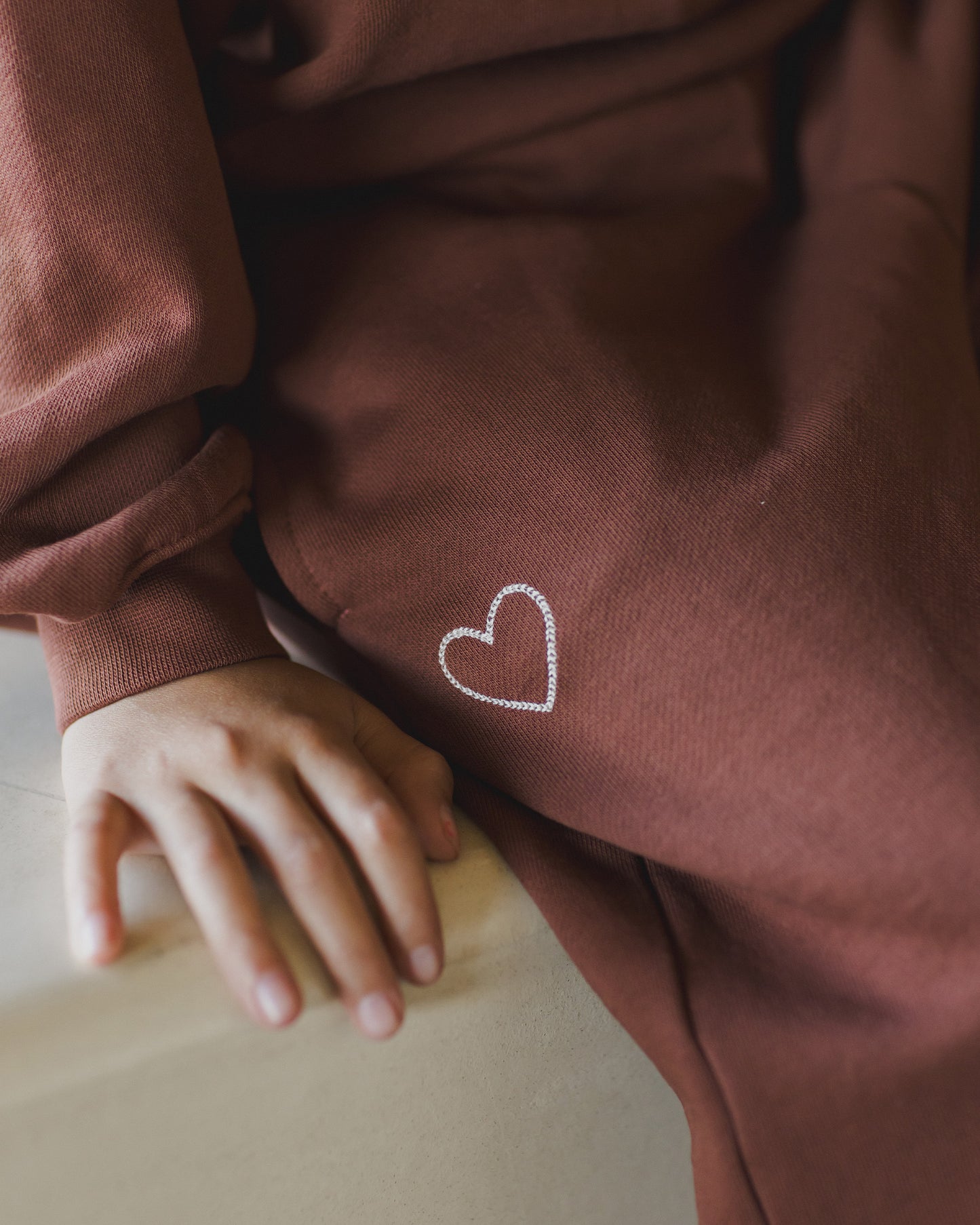Cozy relaxed fit sweatpants featuring a drawstring and elastic waistband. Front pockets and a heart stitched design on a soft washed french terry fabric.
