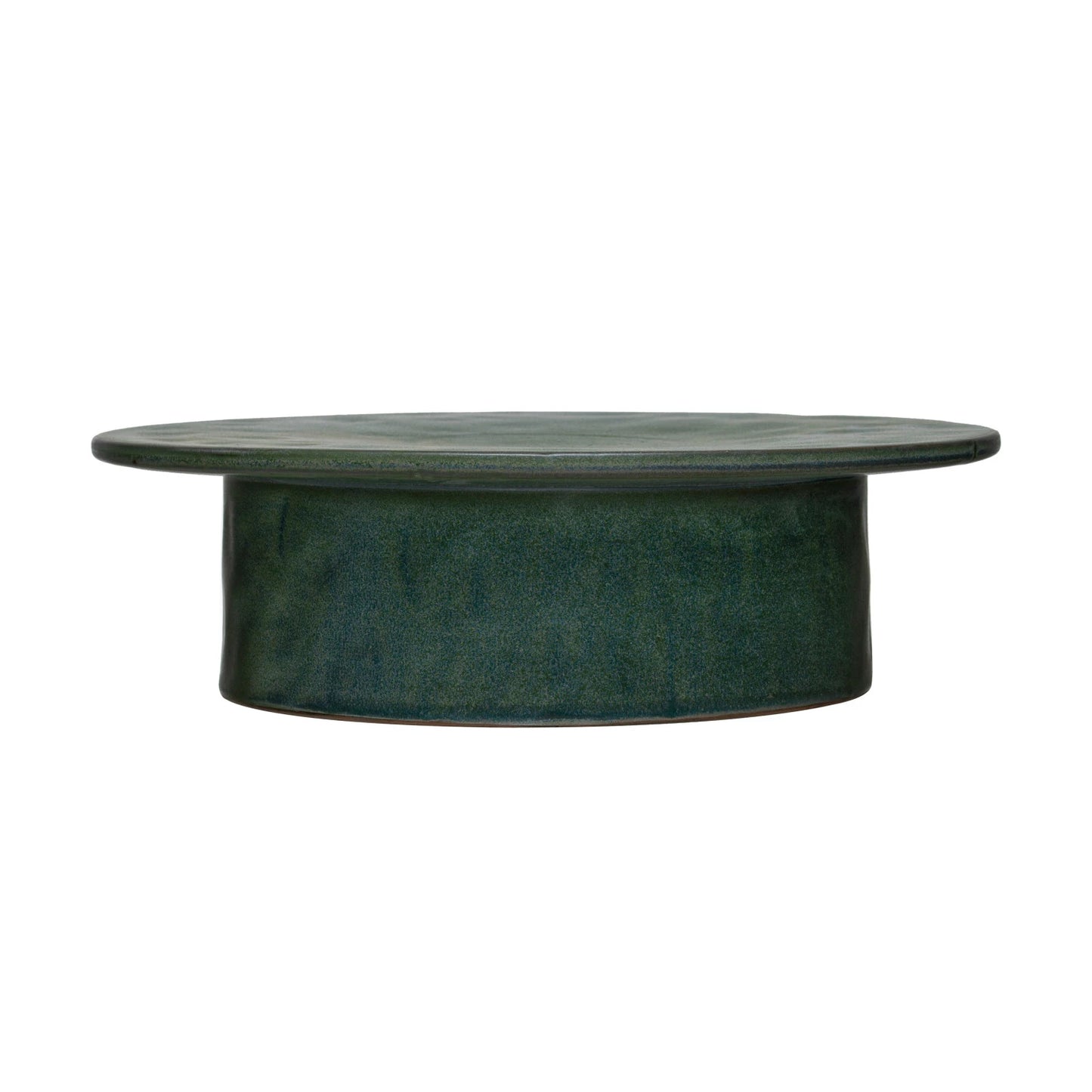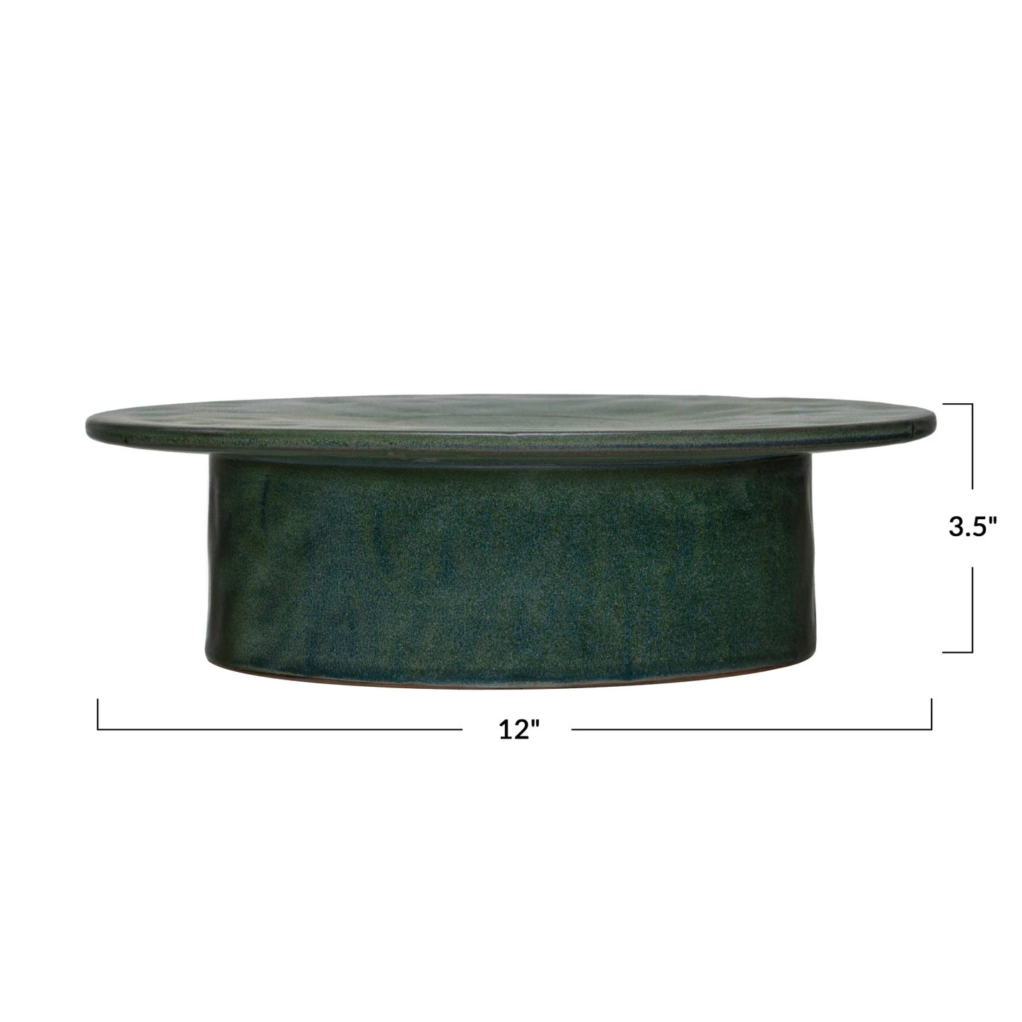 This stoneware pedestal in green is a beautiful addition to any home. Perfect for displaying desserts, fruits, or a stunning floral arrangement. A great gift for any occasion, it is both functional and decorative. Elevate your home decor with this elegant and versatile piece. This contemporary stoneware pedestal features a naturally variating reactive glaze.