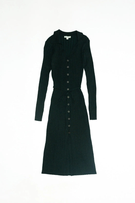 The Dana Dress has an understated fit-to-bodice silhouette, that embodies the elevated wardrobe staple. Featuring a v-neckline, collar, button-front detail and waist belt for added shape in a midi length.