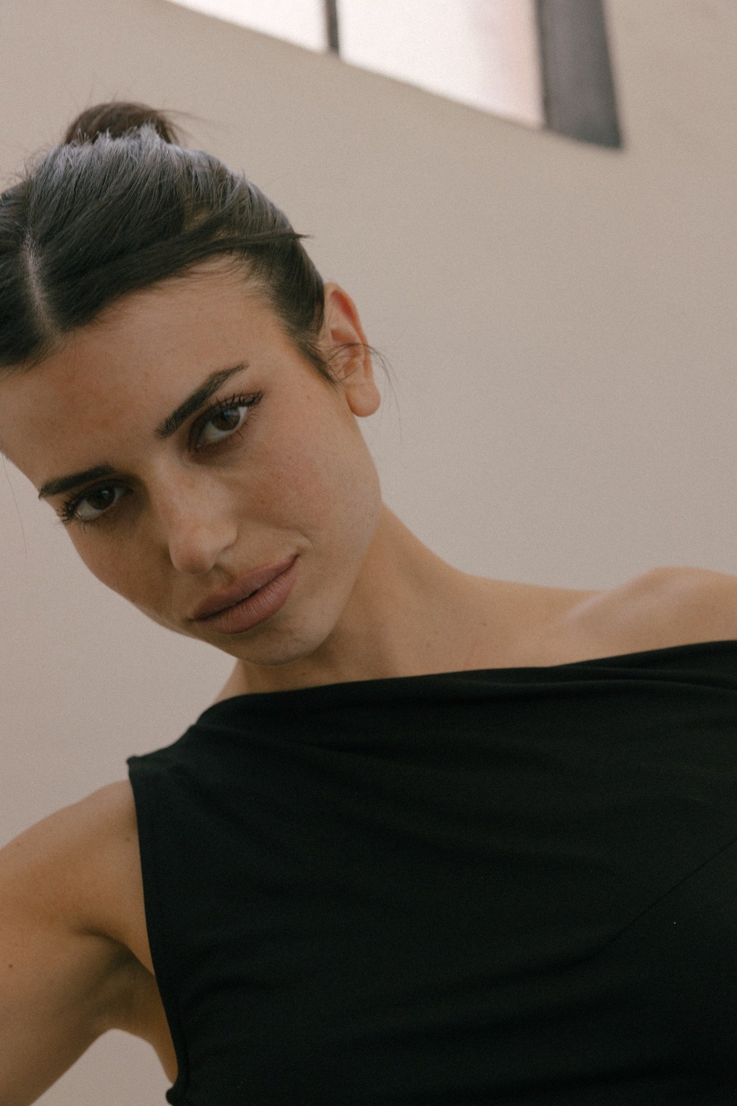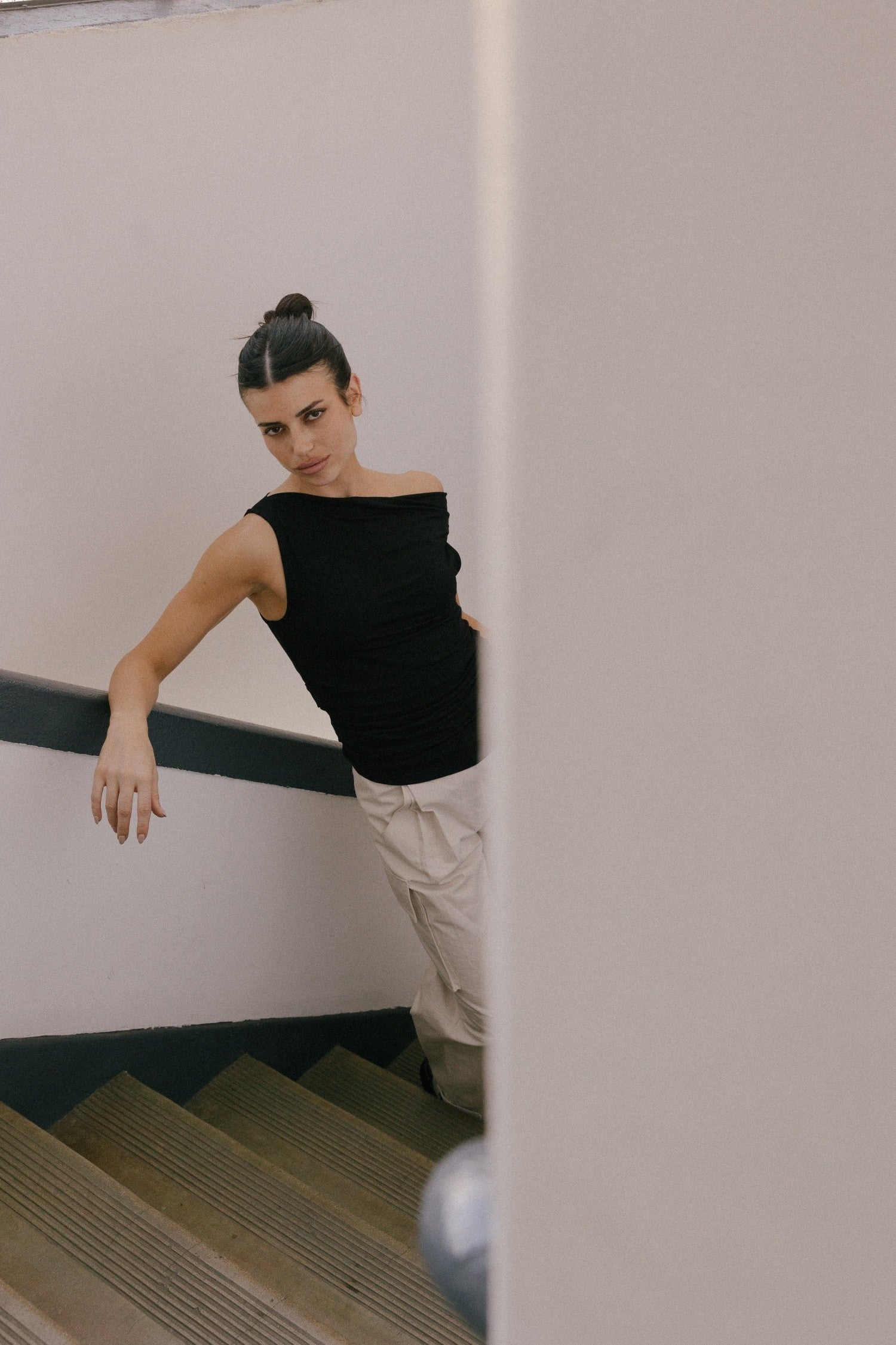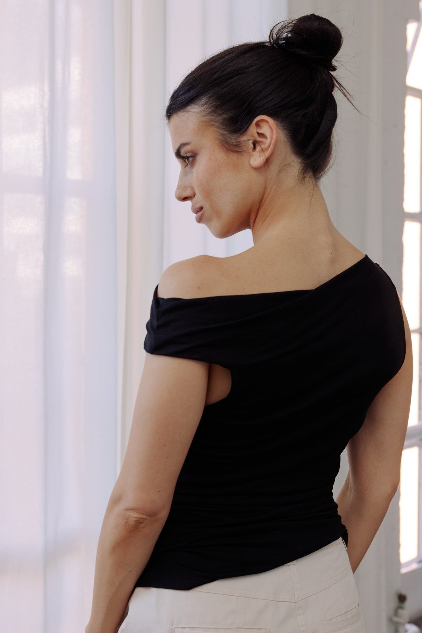 The Emilia Top is a fitted top that is made from a soft, stretch modal-blend fabrication. It boasts an asymmetrical twist shoulder and ruched at the waist. An easy summer style to pair with linen shorts and mini skirts.
