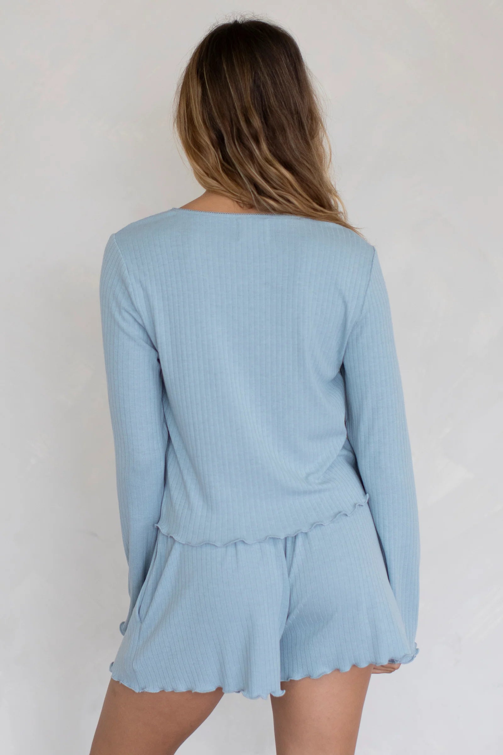 Soft, pointelle set with lettuce edge details. Comes with a long sleeve top and shorts that have pockets and an elastic waistband.