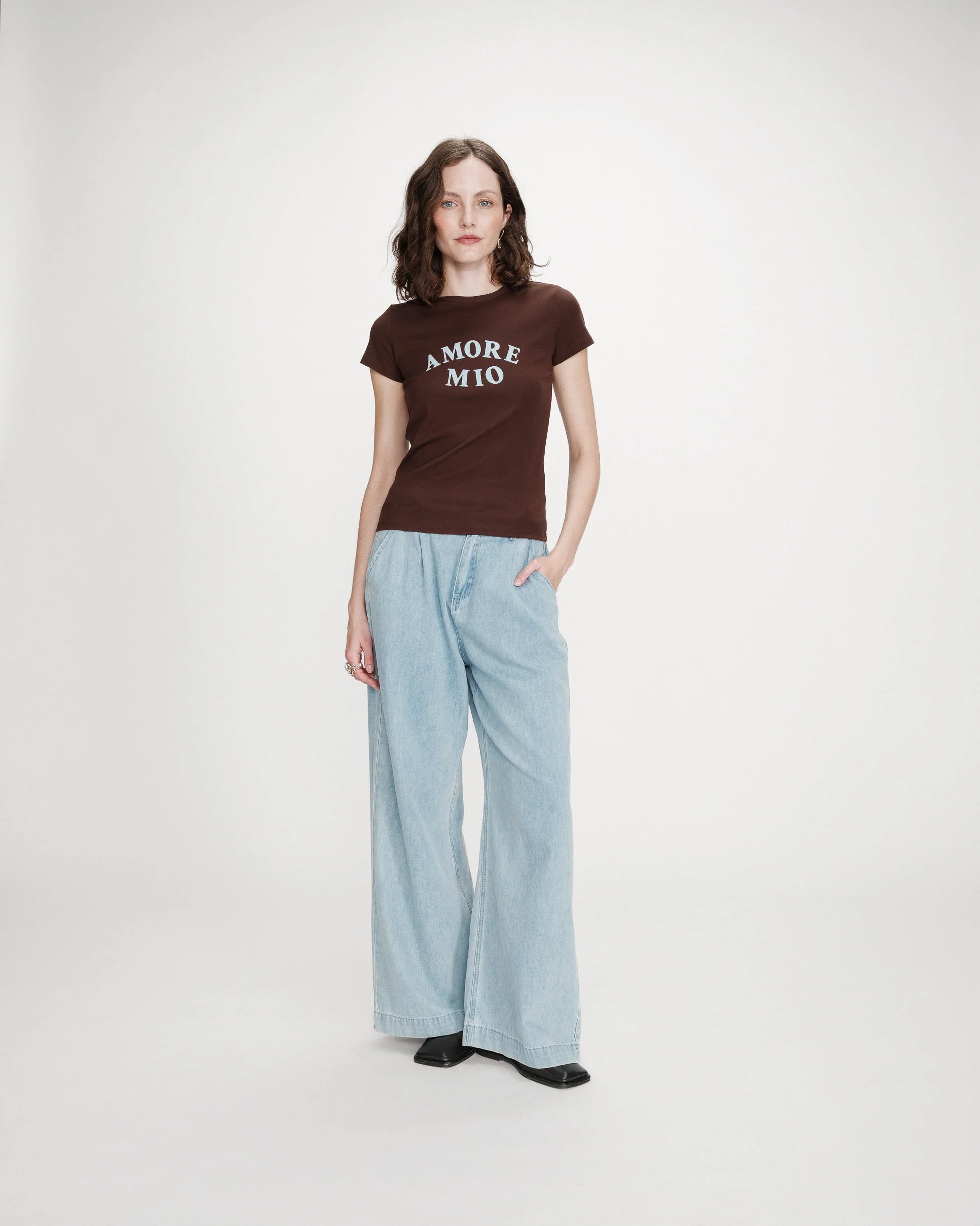 The VALERIO message T-shirt, made from 100% cotton fabric, is a comfortable and relaxed piece. The fitted cut, short sleeves, and round neckline enhance feminine curves, while the velvet printed message adds a modern and graphic touch.