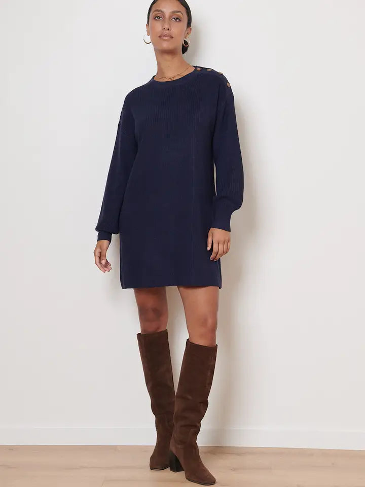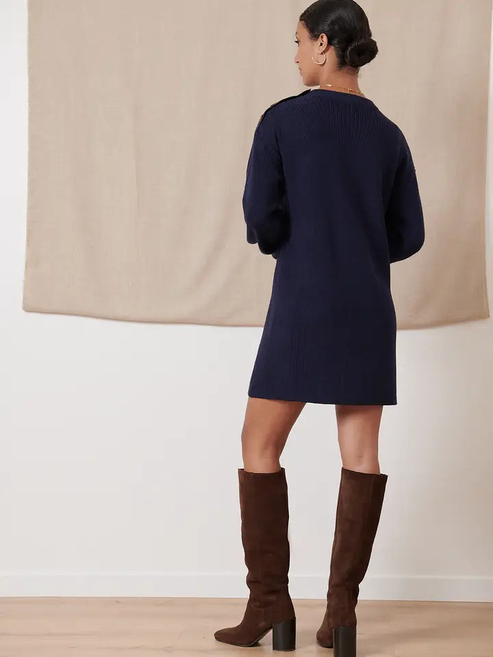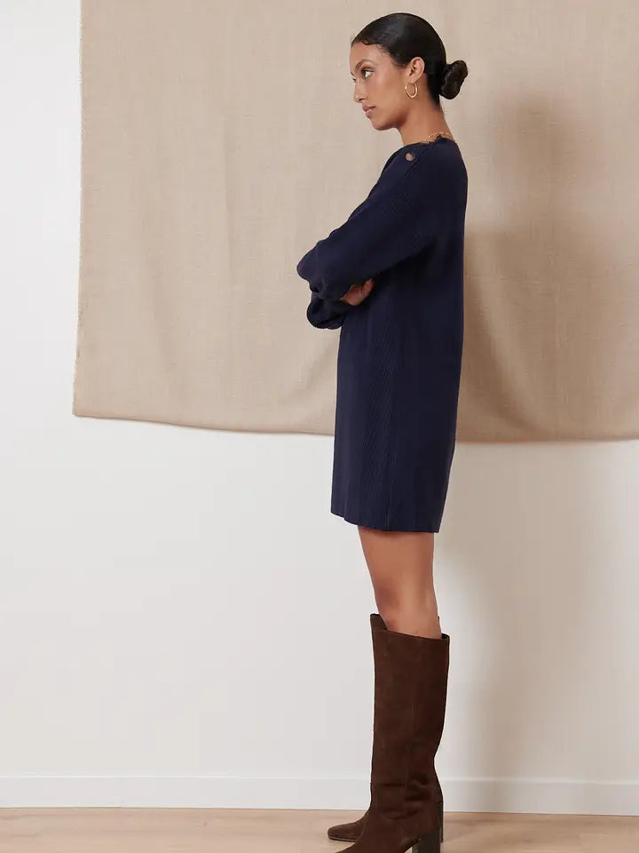 Expertly crafted, the Tiphaine Knit Dress in marine offers the perfect blend of comfort and style. Made with a soft fabric of 55% viscose, 25% Merino wool, and 20% acrylic, this sweater dress showcases a unique shoulder button made of horn. Hand washable for easy care.