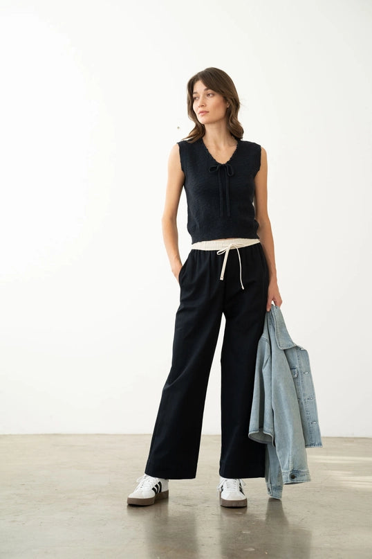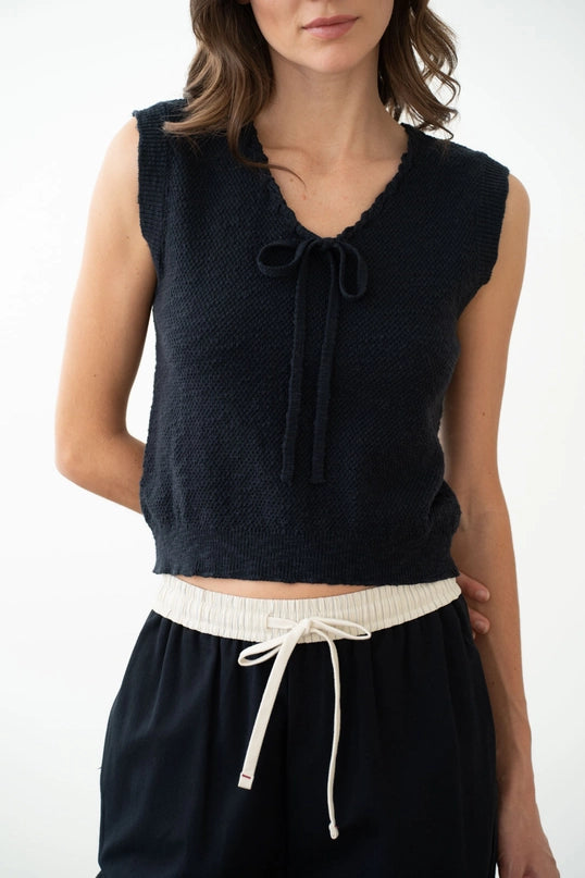 As an industry expert, I confidently assert that our V-Neck Knit Vest with Neck Tie in Navy is not only beautiful and trendy, but also provides comfort and a flattering summer fit. Its casual yet sweet design offers a modest touch to any outfit. Perfect for all occasions.