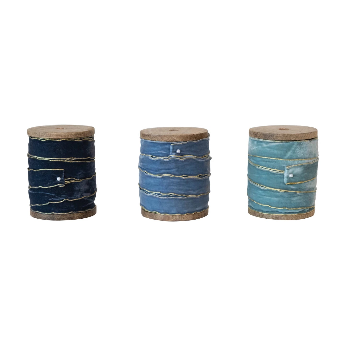 This set of 3 velvet ribbons with metallic edges on a wood spool is a versatile and elegant addition to craft projects. Made of viscose and lurex, these ribbons have a velvety and glittery feel and are high-quality and flexible. Each ribbon comes in a different color, such as blush, rust, or baby pink, adding warmth and variety to the collection. The metallic edge adds contrast and sparkle. These ribbons are versatile for wrapping gifts, making bows, decorating cards, or embellishing home accessories, and they suit any occasion or theme. The set measures 180 inches in length. The set of three ribbons is a versatile addition to any craft project, adding depth and variety to the collection.