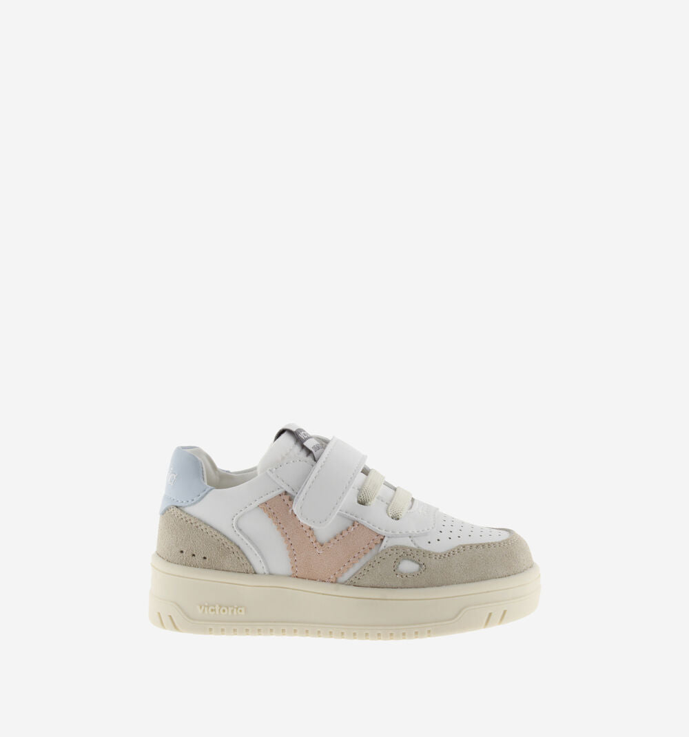 These kids' white shoes, made from high quality faux leather with split leather overlay at the toe, heel and logo, stand out for their design. Retro V and at the side in contrast with the back and window detail at the side. Light brown sole and elastic laces and strap fastening. Includes additional padded insole for improved comfort.