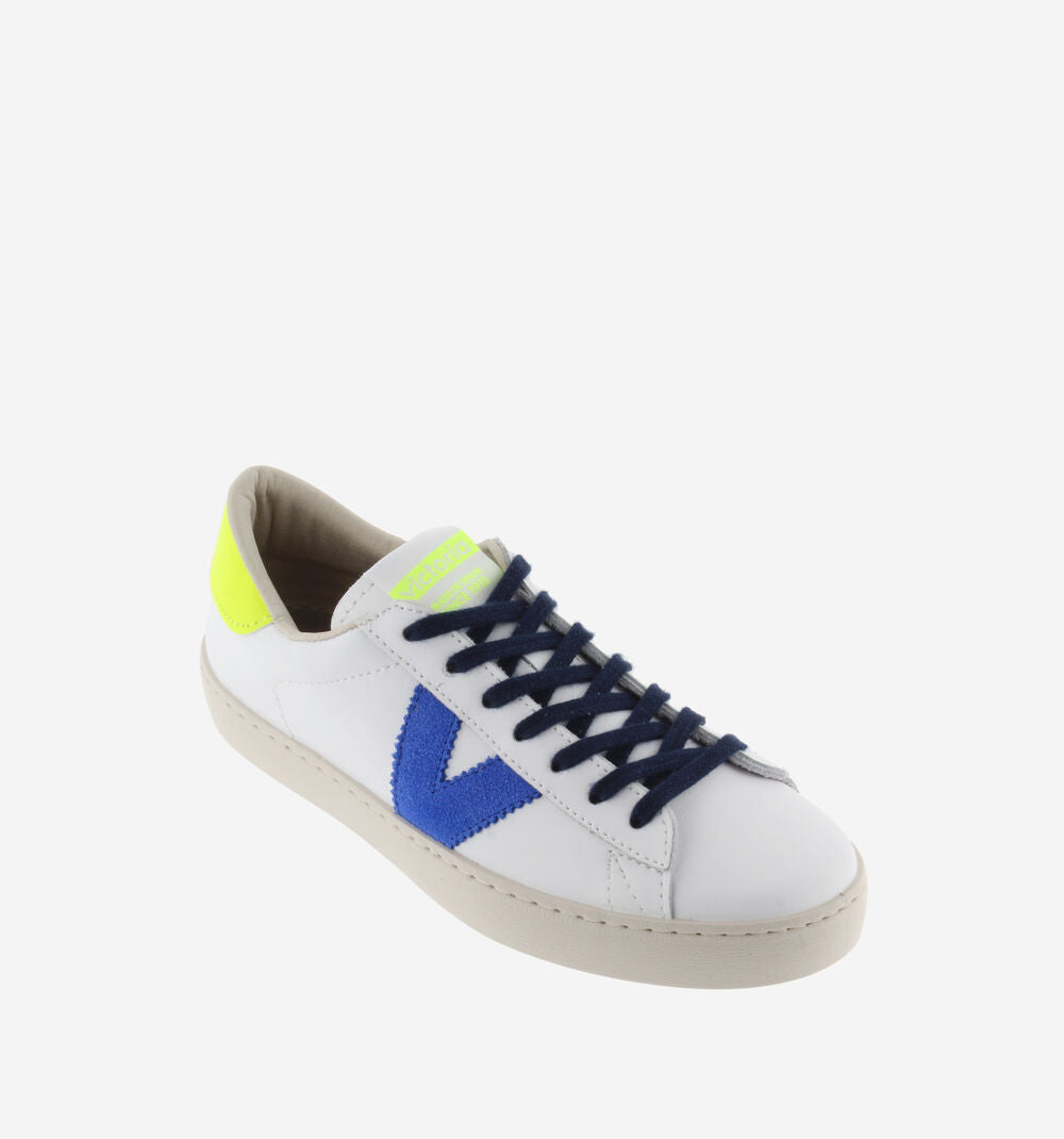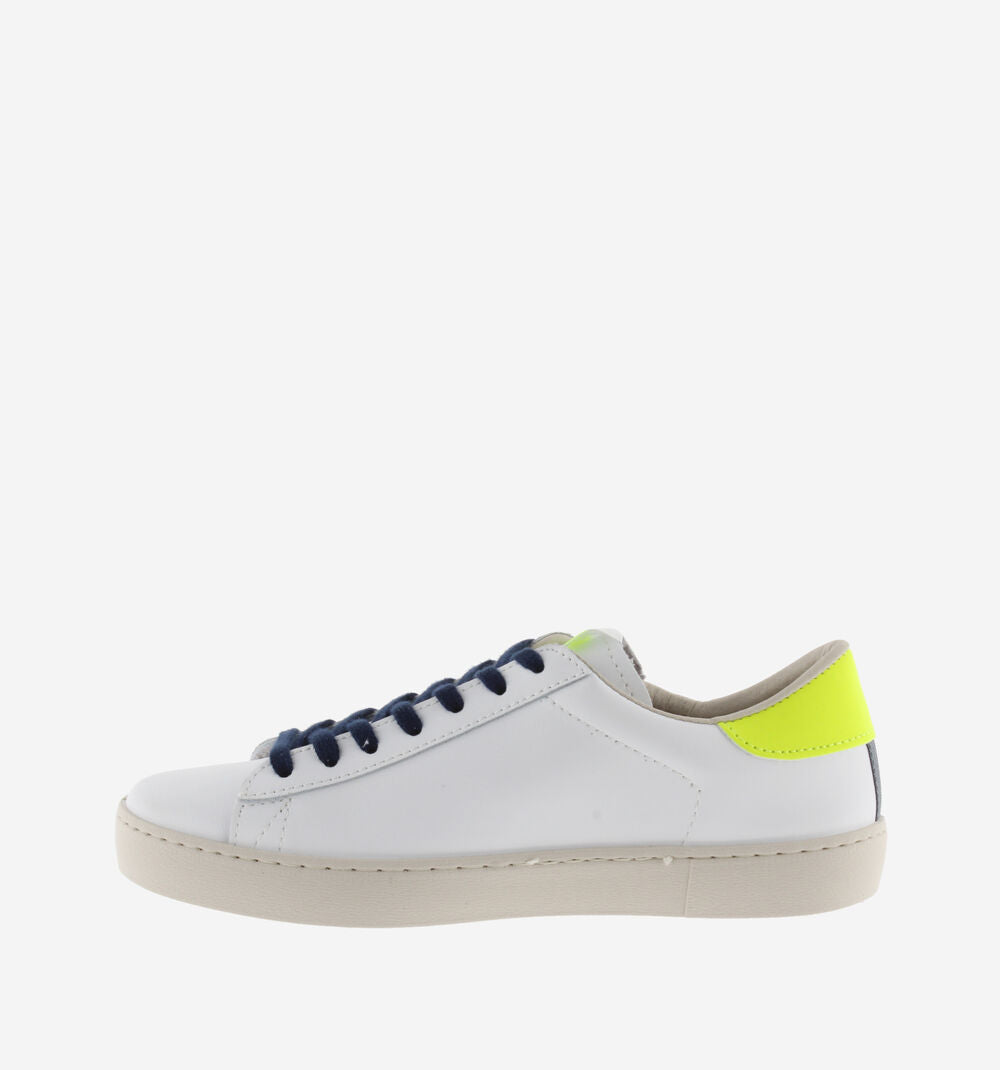 White tennis sneaker with contrast neon panels. Made Spain in LWG silver-rated leather, guaranteeing water, energy and waste have been managed responsibly during the tanning process.