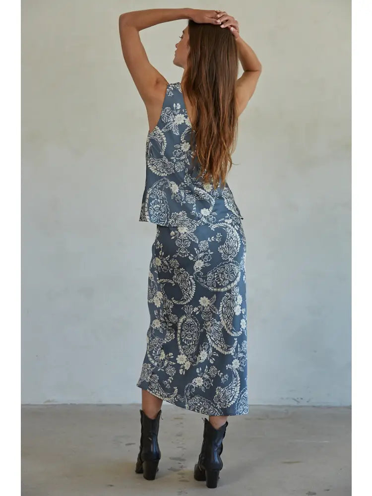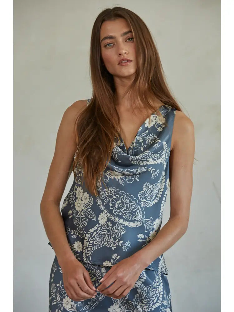 Woven Polyester Floral Cowl Neck Top - Midnight Blue